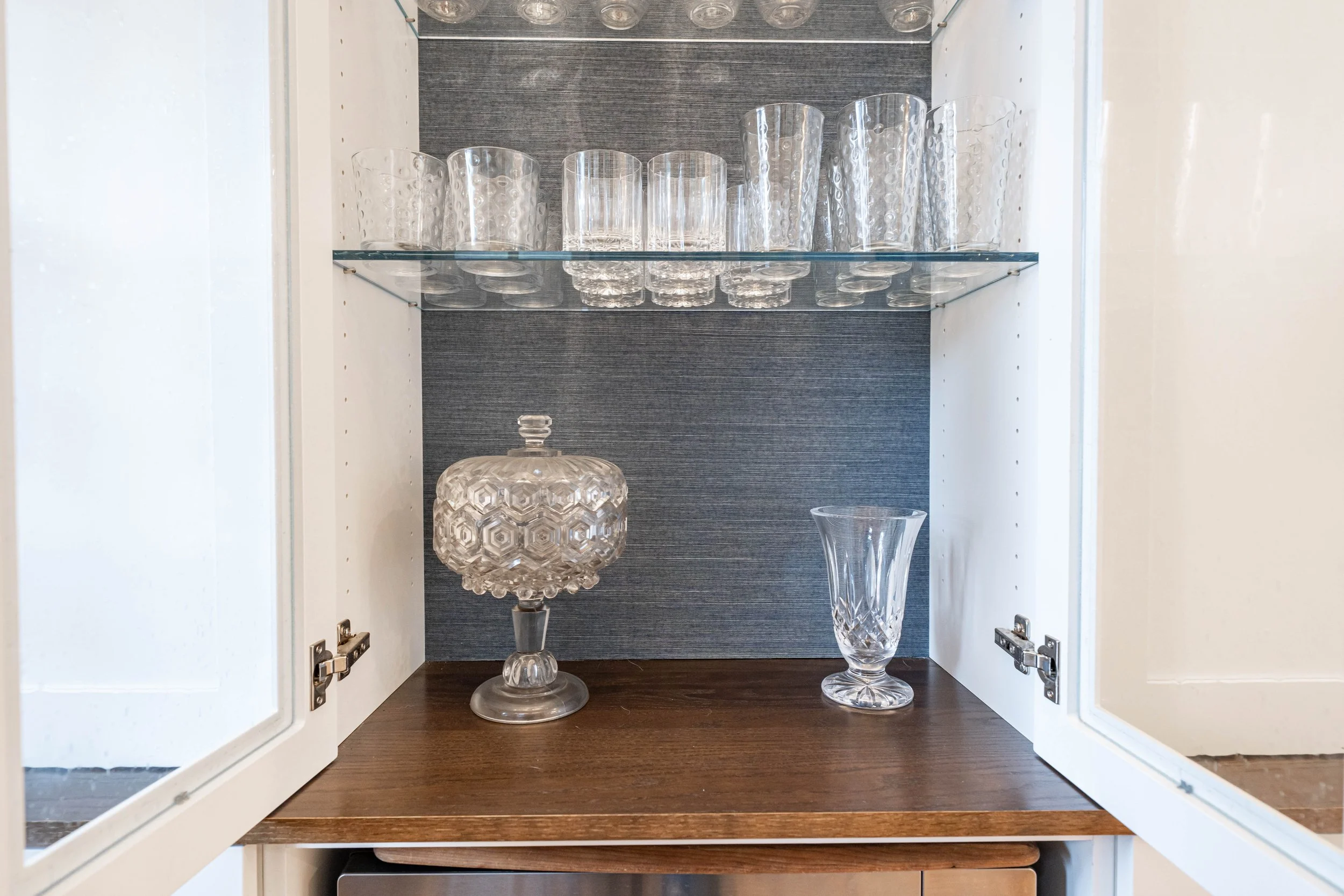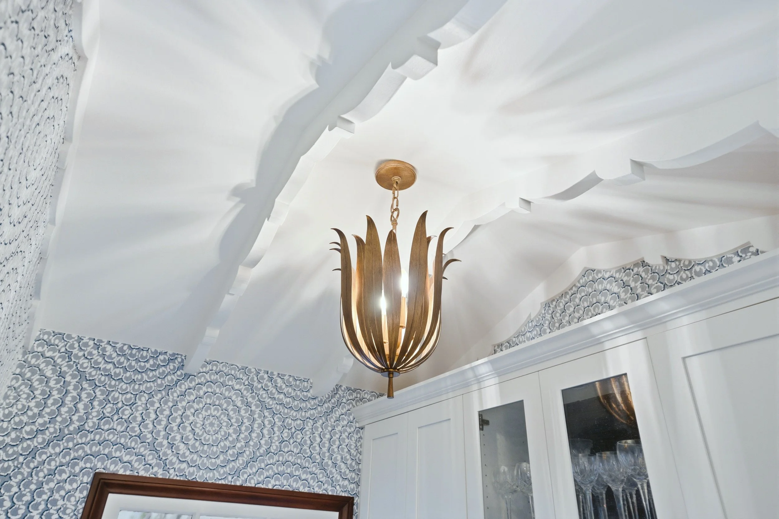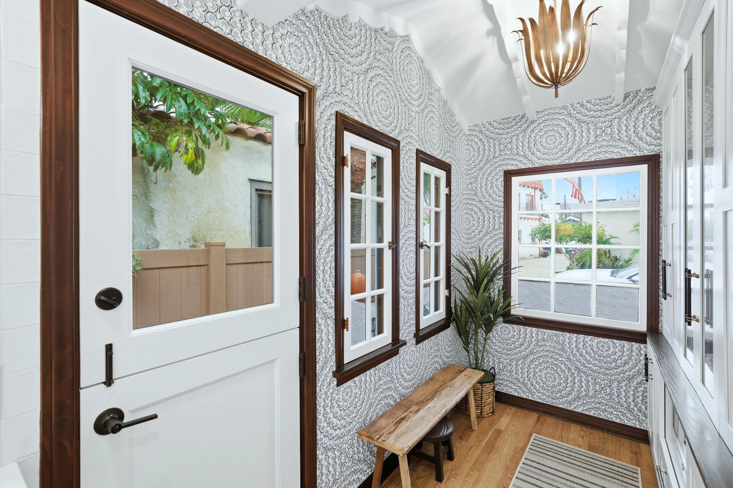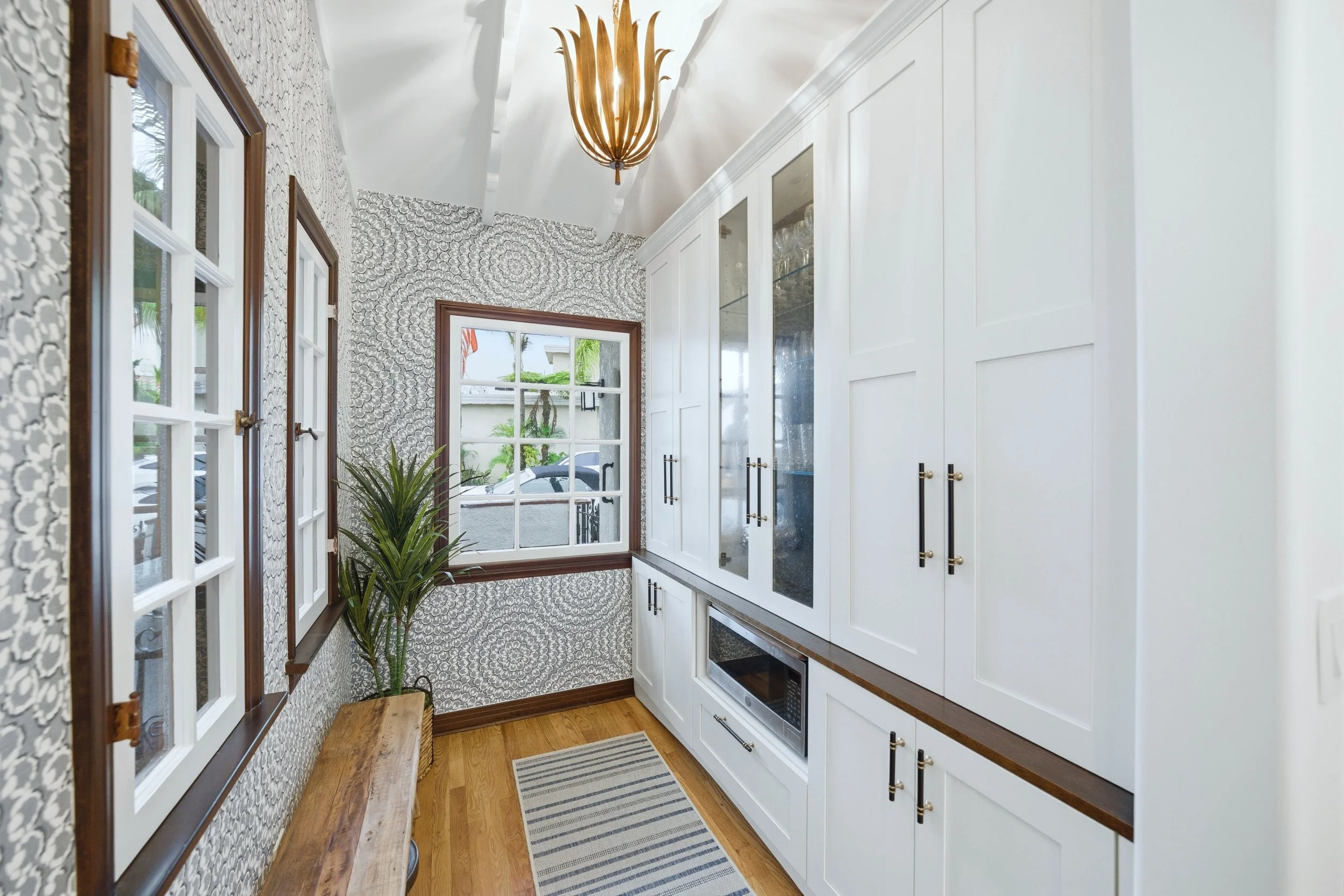 Just beyond the kitchen, the pantry unfolds like a hidden gem—a cozy nook lined with soft blue wallpaper that adds depth and personality. White cabinets and walnut touches tie the space back to the kitchen, while black-and-gold hardware and a rustic gold light fixture introduce playful contrast. The wood flooring carries throughout, grounding each space in warmth and unity. Together, the kitchen and pantry feel effortlessly connected to the home’s Spanish roots, elevating its beauty while making it more practical for modern living.