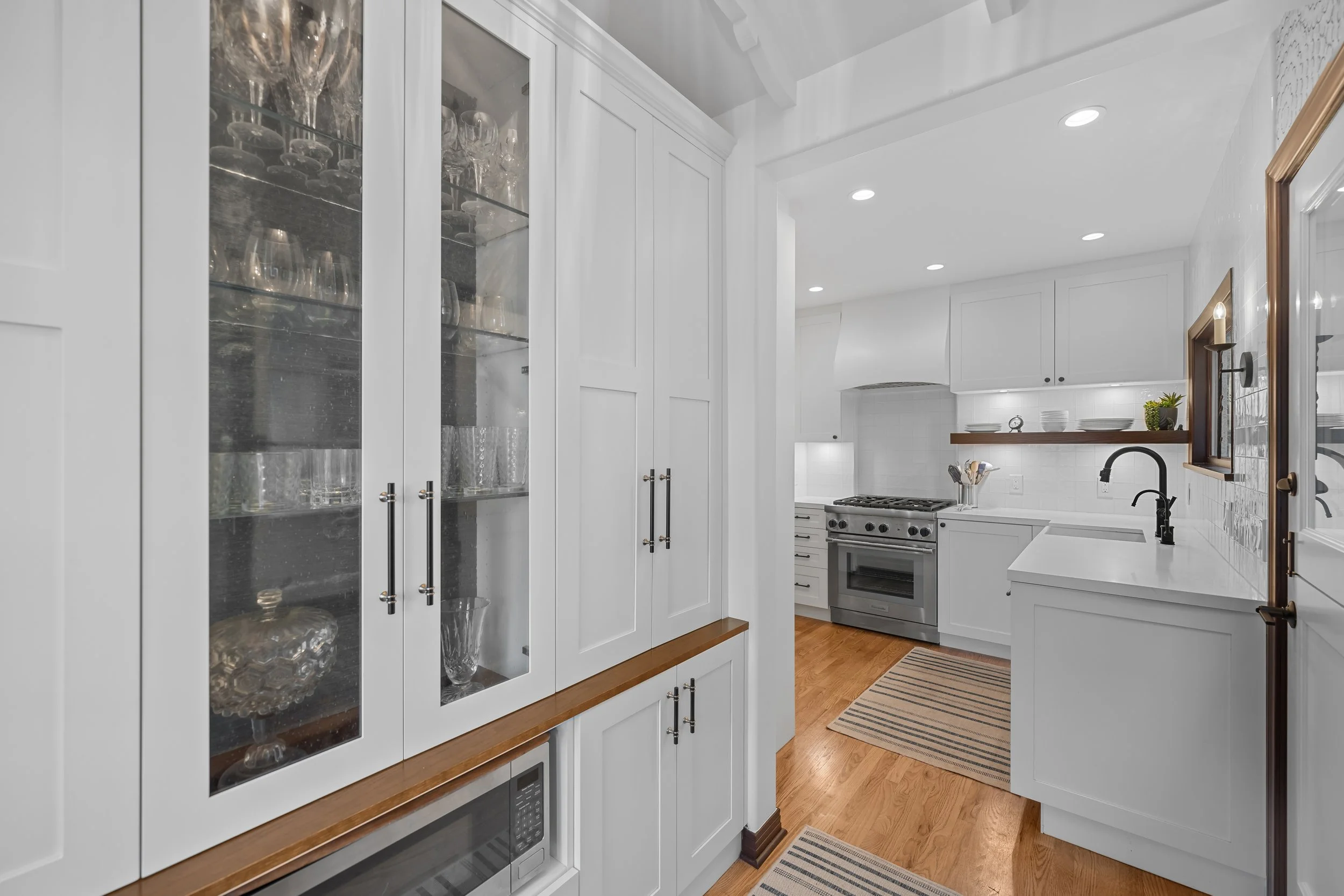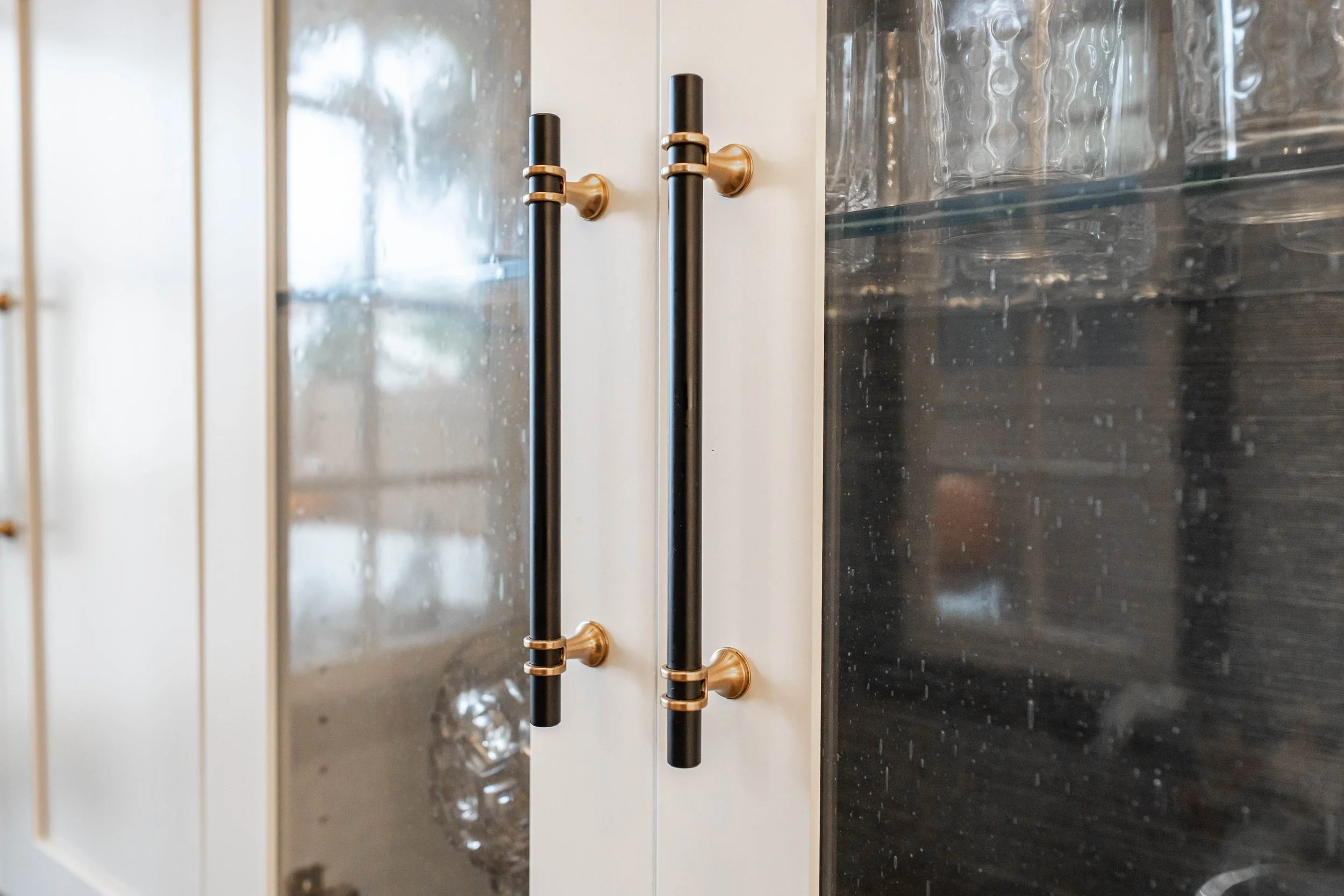 Tucked within Naples’ charming Corinthian Walk, this Spanish-inspired home carries all the character of the Mediterranean—arched openings, exposed wood beams, and handcrafted details that give it soul. Our remodel honored that charm while bringing new life to the heart of the house: the kitchen. What was once a tight, difficult entryway is now an open and inviting passage, creating a seamless flow from room to room. The refreshed space embraces a clean palette of white cabinetry, striking black hardware, and warm walnut accents that frame the windows, doors, and floating shelves. Every finish was chosen to complement the home’s architecture, blending old-world warmth with everyday functionality.